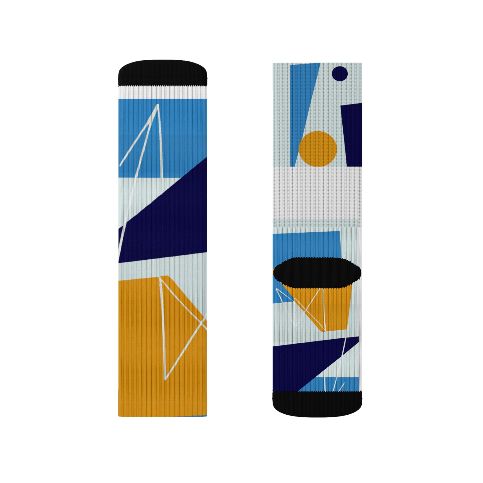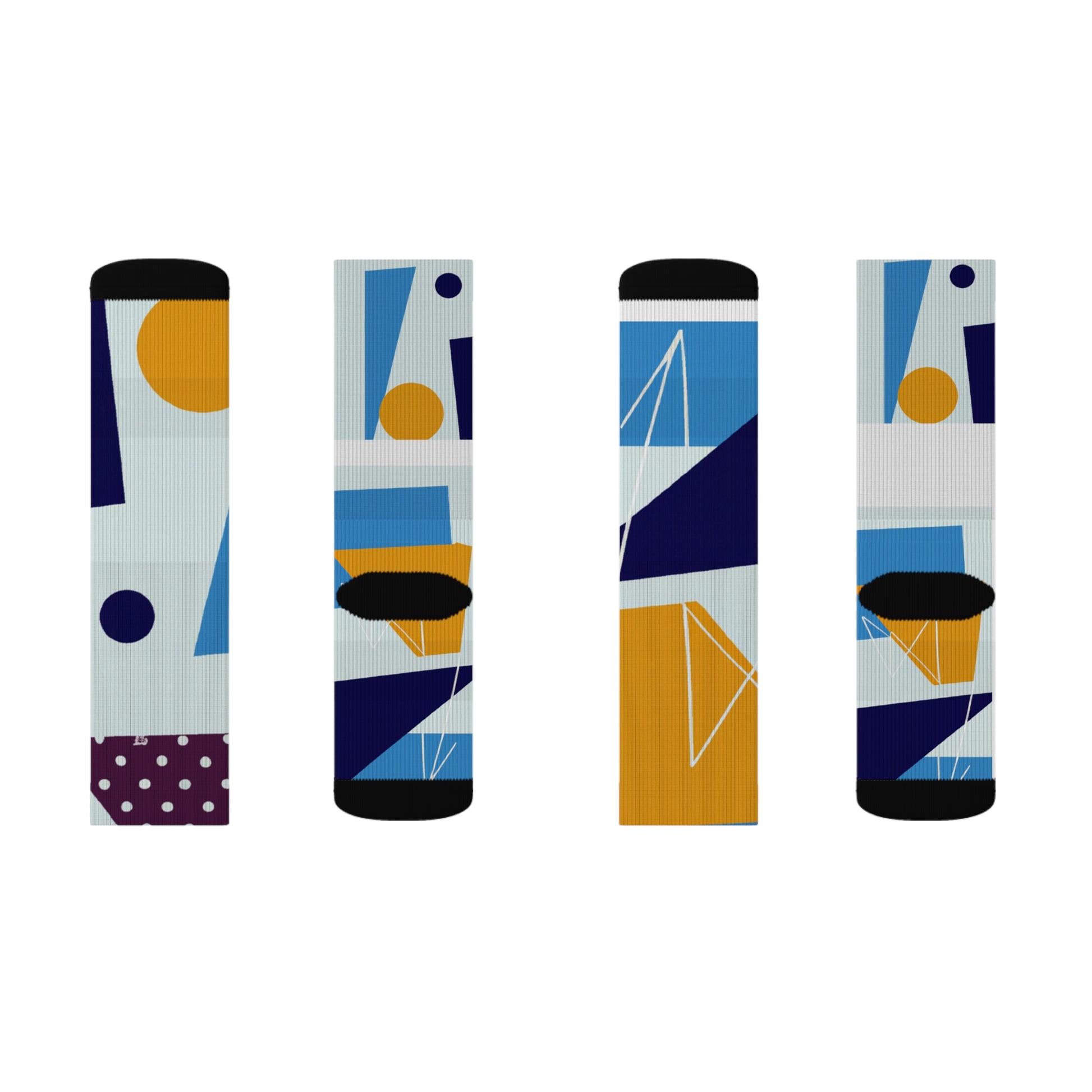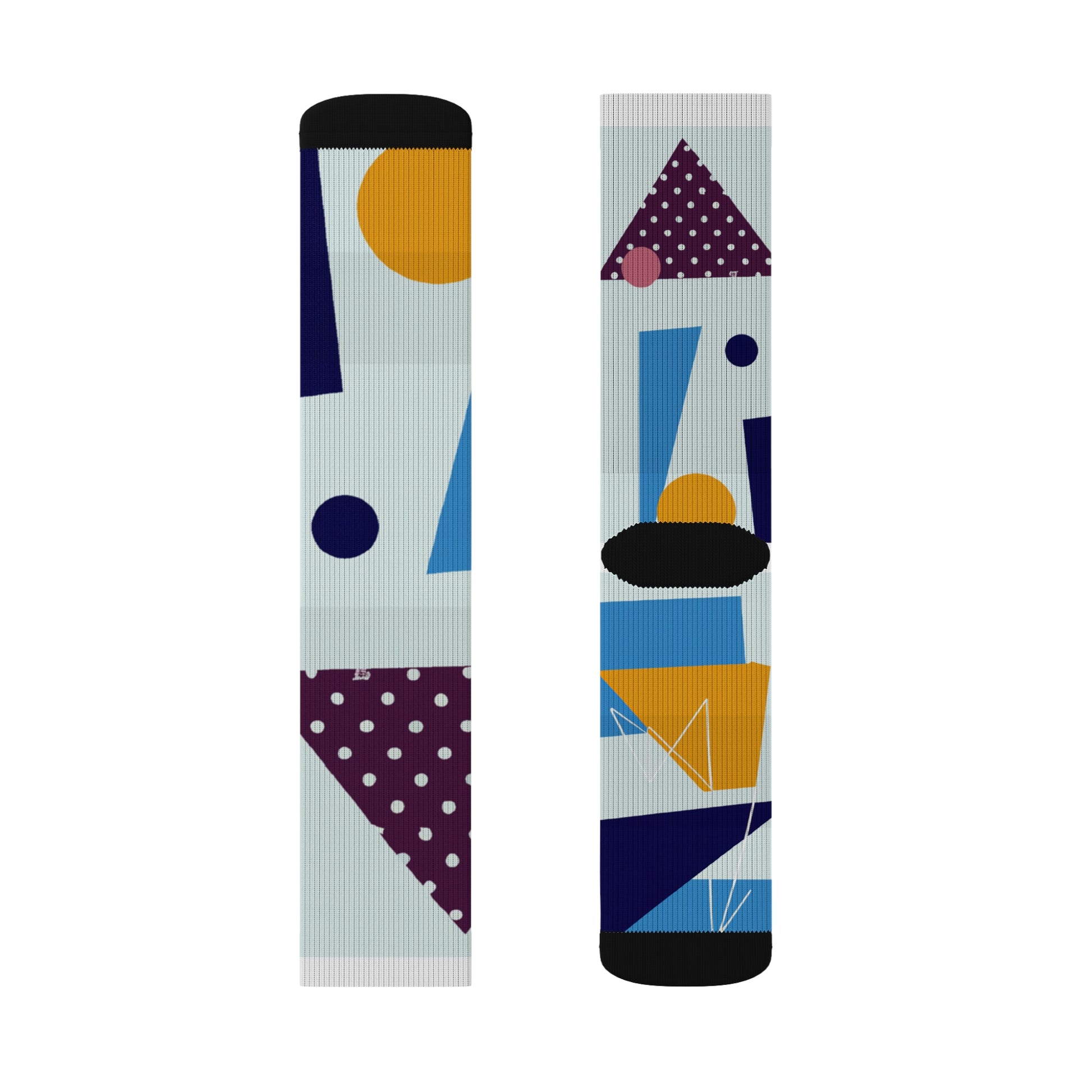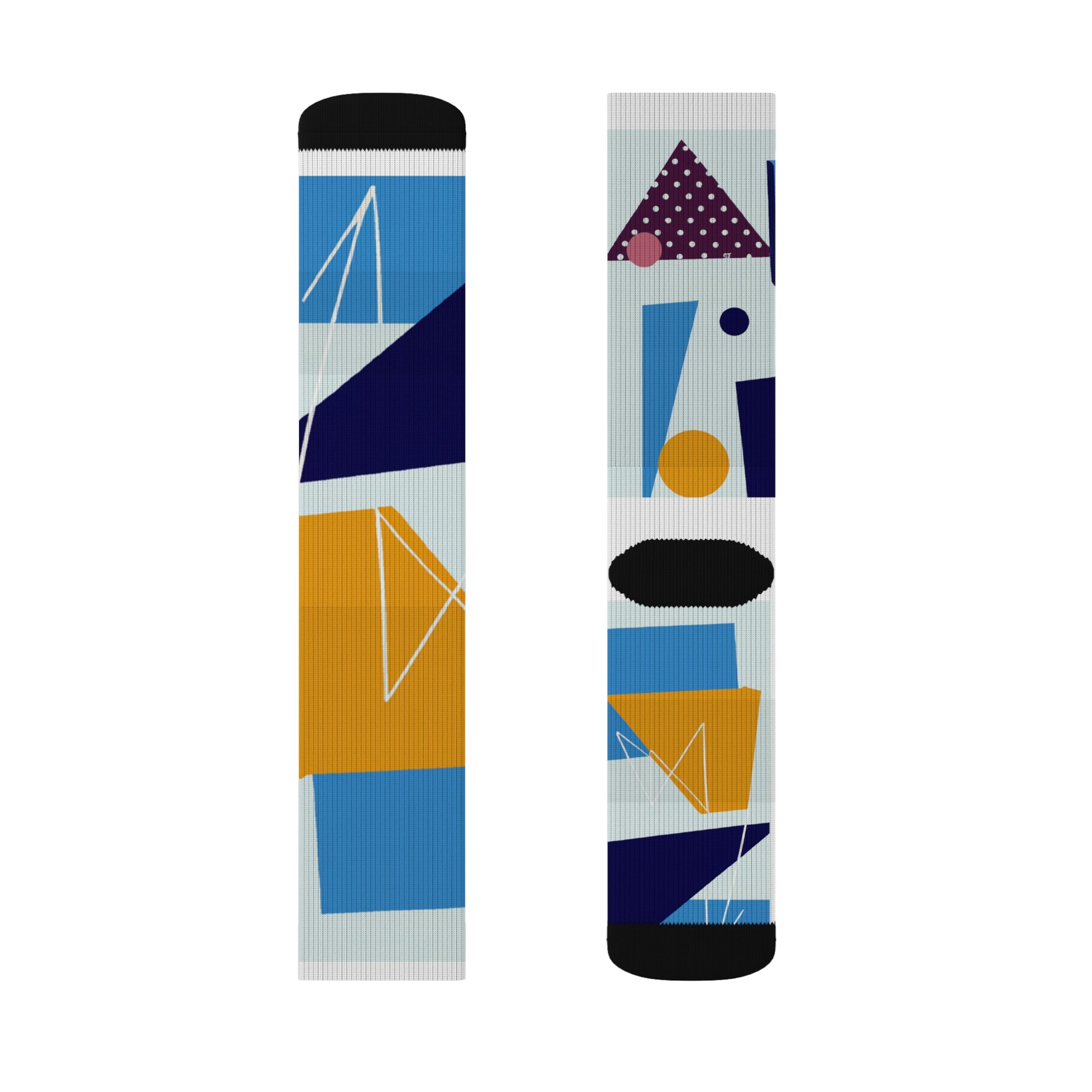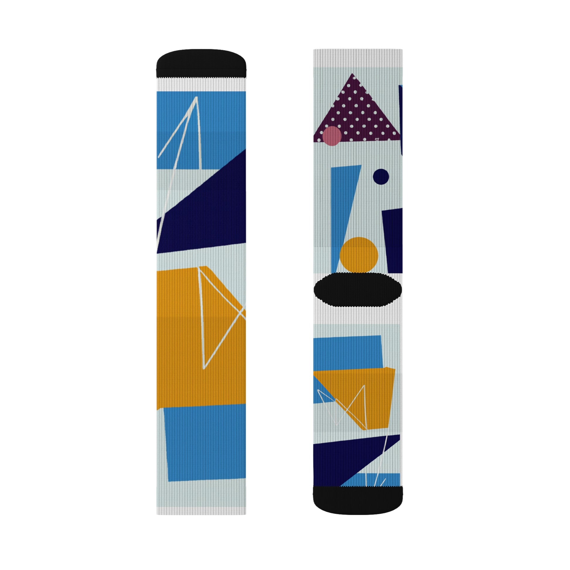 What makes these socks truly special is their striking design. Against a backdrop of sleek black, an array of dynamic geometric shapes in shades of deep blue, vibrant yellow, and rich maroon intertwine to create a mesmerizing pattern. From bold triangles to intricate swirls, each element adds depth and visual interest, making these socks a true work of art.