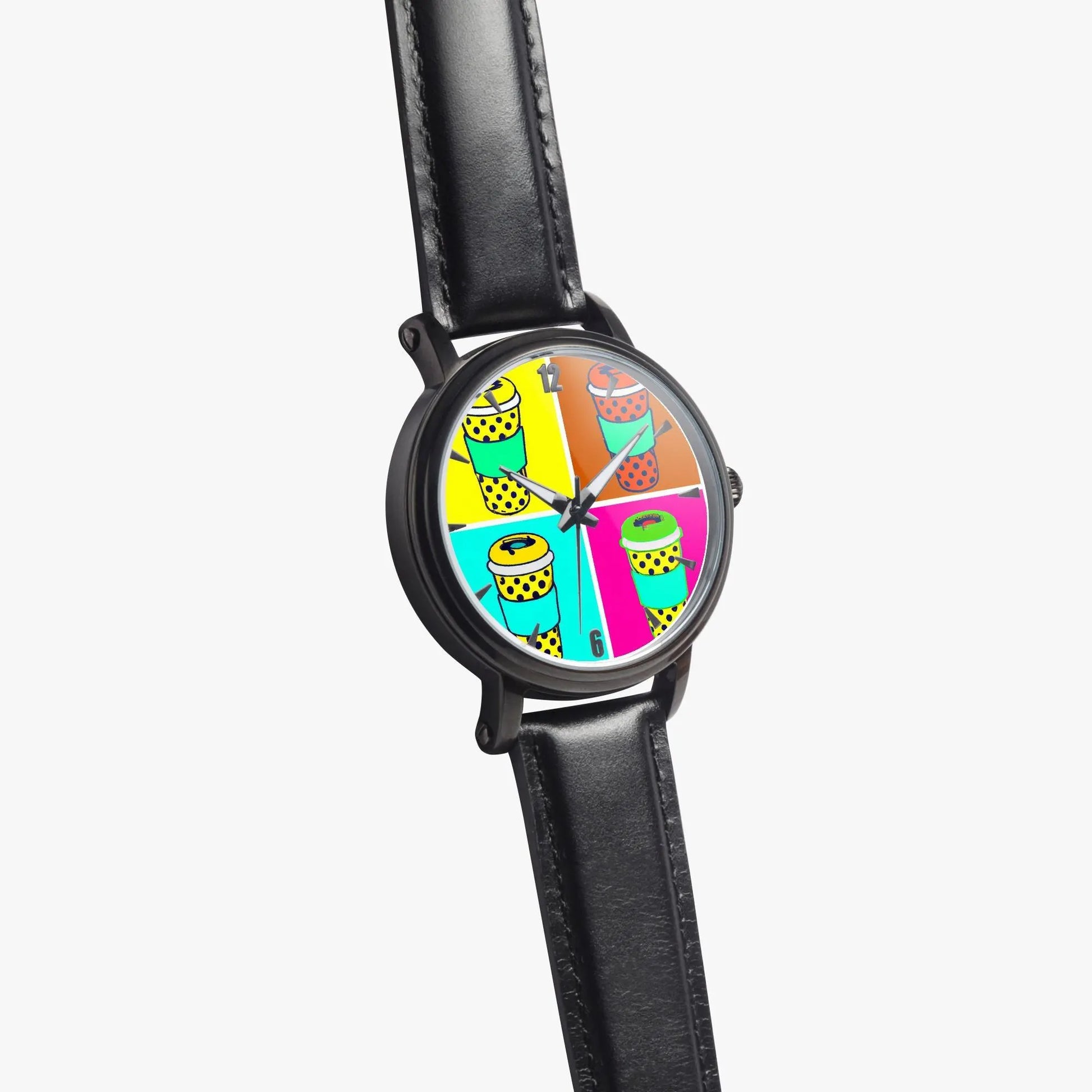 Fuel your love for bold design and great coffee with the Pop Art Coffee Mugs Automatic Leather Watch a kinetic masterpiece that brings energy, color, and creativity to your wrist. Inspired by the unmistakable style of Andy Warhol, this custom timepiece features a vivid array of coffee mugs on the dial, each rendered in punchy, contrasting tones that celebrate the ritual of your daily brew through the lens of modern art.