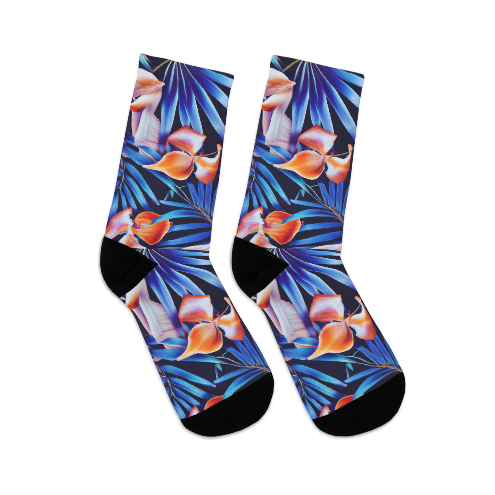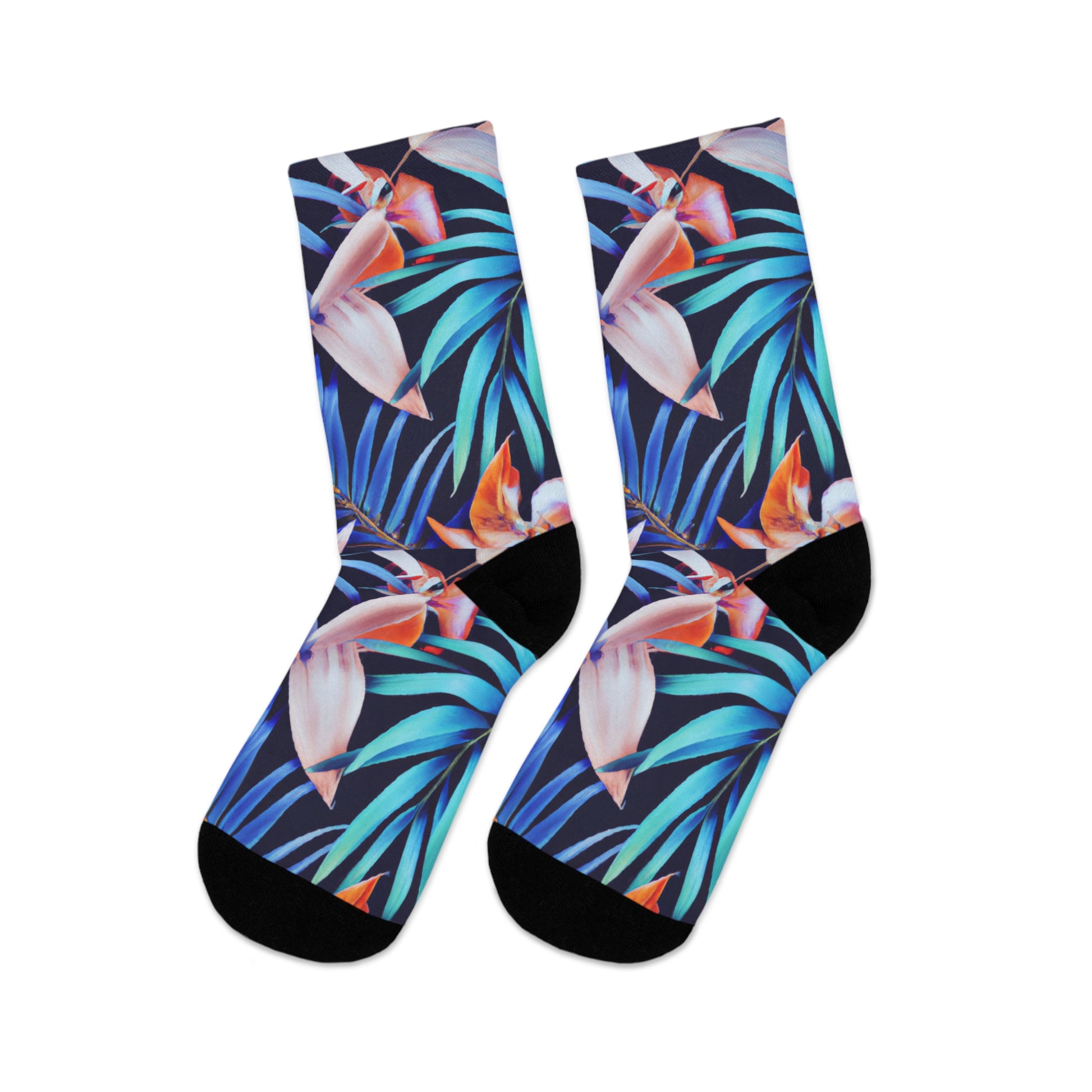 These socks are made using a proprietary blend of yarns specially sourced by Tribe Socks. They are 200 needle knit crew made from 58% Recycled Polyester 22% Nylon 15% Cotton and 5% Elastane. They are a true one size fits most, and are available up to size 12 Men's (U.S.). These socks have an unprecedented amount of stretch with durable print quality. .: 58% Recycled Polyester 22% Nylon 15% Cotton 5% Elastane .: 200 needle knit premium socks .: One size fits all (W's size 5 US up to M's size 12 US)