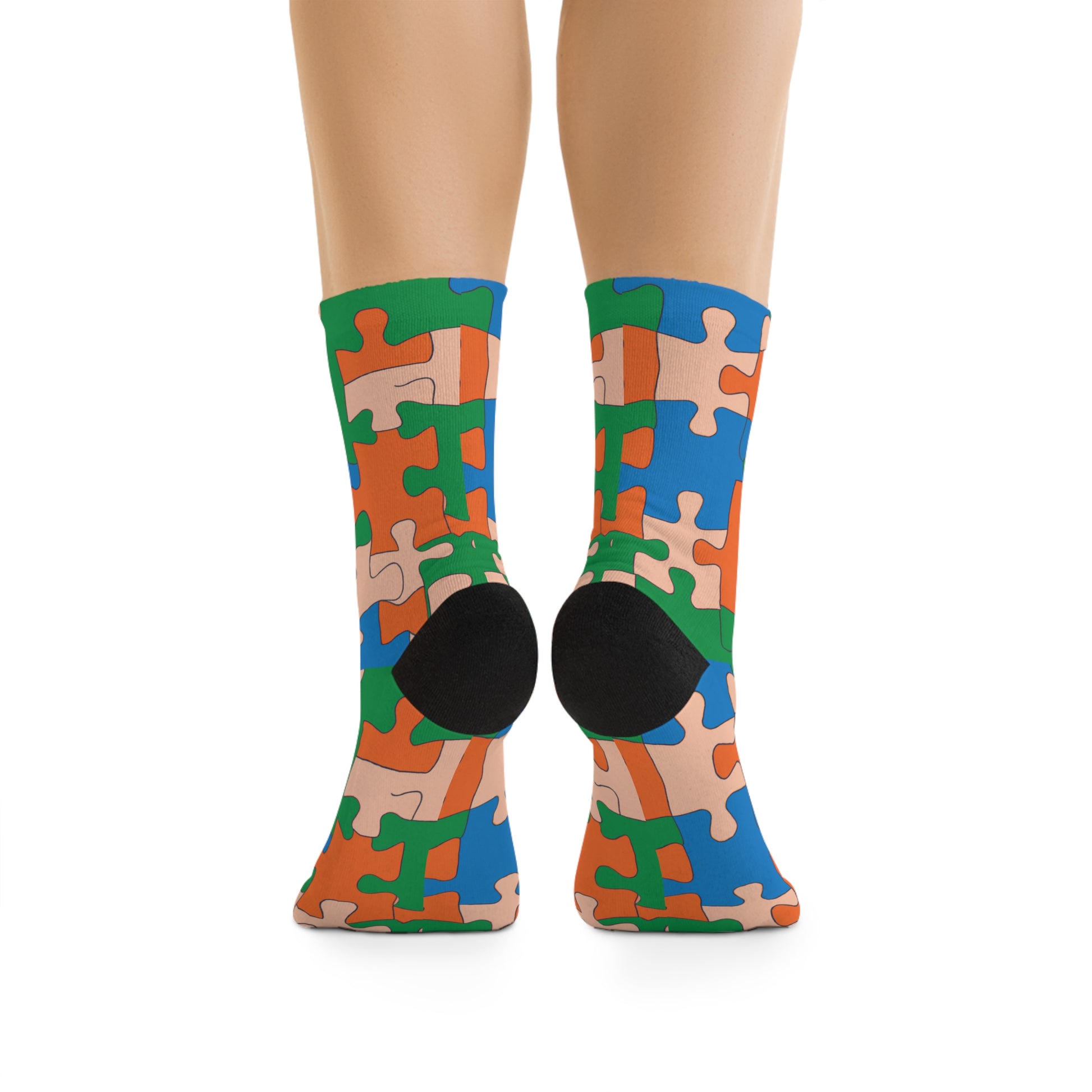 These socks are made using a proprietary blend of yarns specially sourced by Tribe Socks. They are 200 needle knit crew made from 58% Recycled Polyester 22% Nylon 15% Cotton and 5% Elastane. They are a true one size fits most, and are available up to size 12 Men's (U.S.). These socks have an unprecedented amount of stretch with durable print quality.