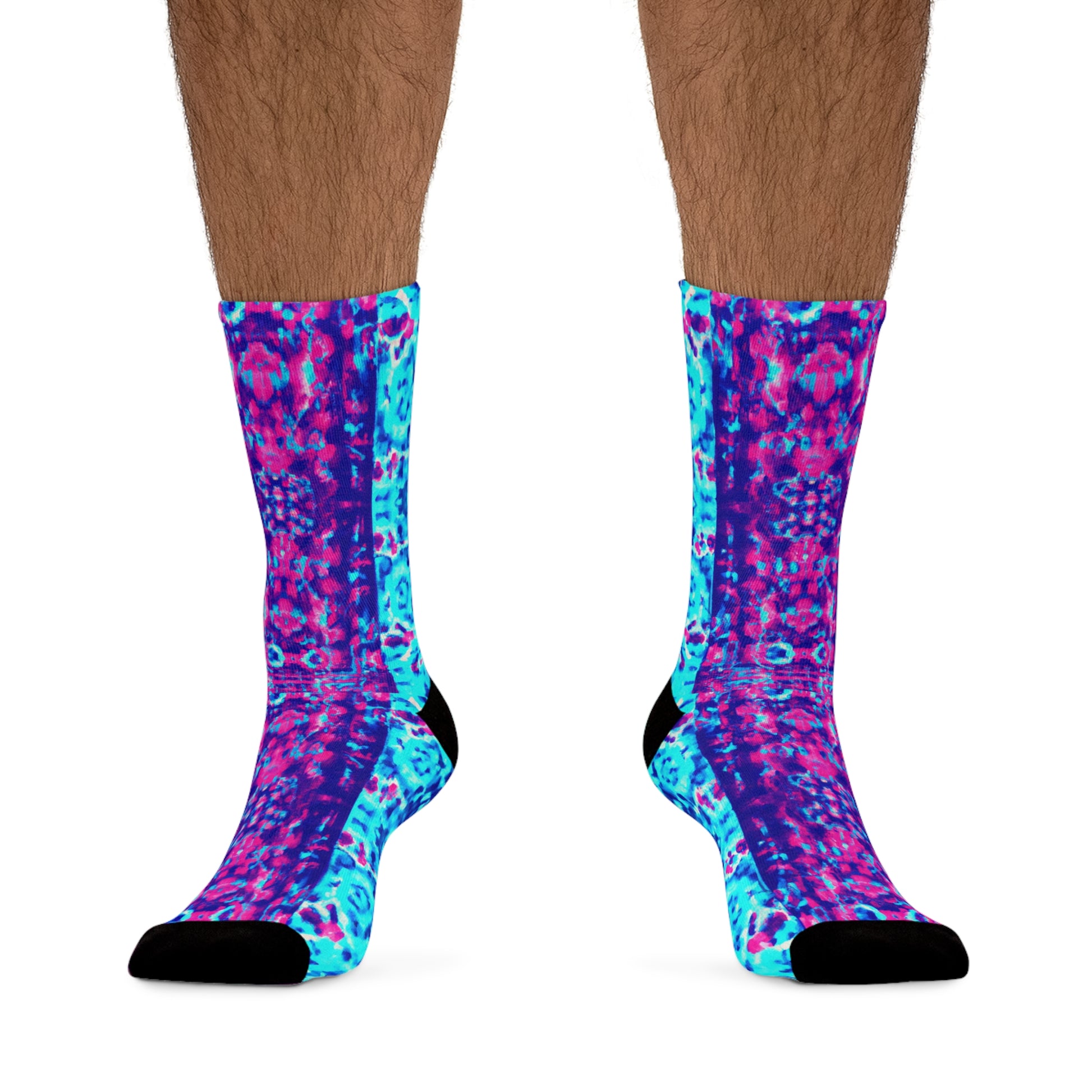 These socks are made using a proprietary blend of yarns specially sourced by Tribe Socks. They are 200 needle knit crew made from 58% Recycled Polyester 22% Nylon 15% Cotton and 5% Elastane. They are a true one size fits most, and are available up to size 12 Men's (U.S.). These socks have an unprecedented amount of stretch with durable print quality.